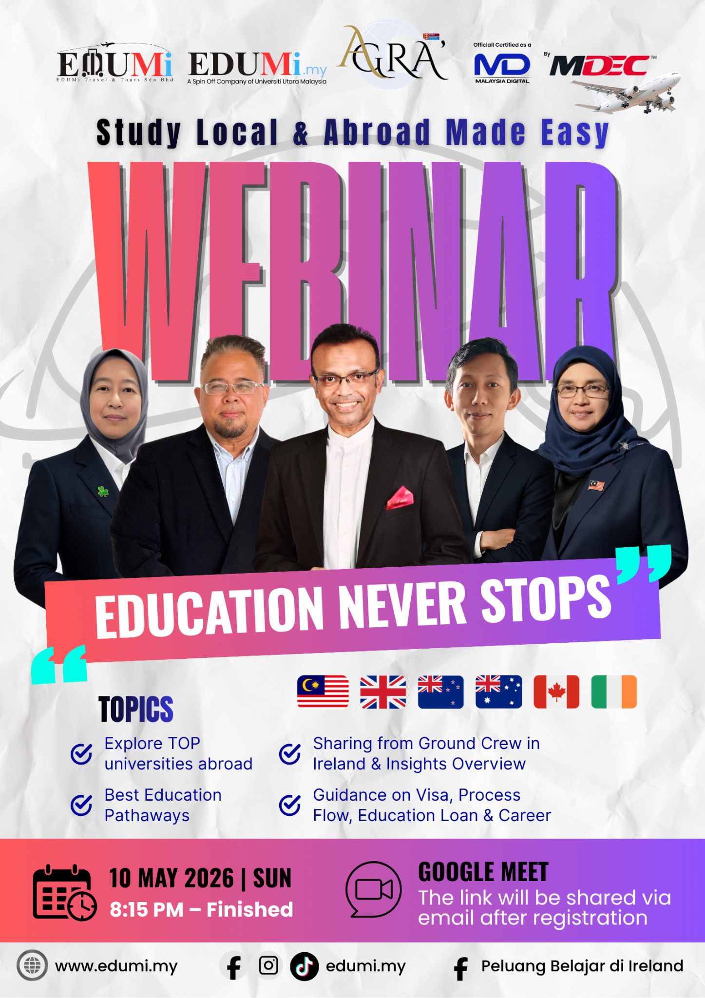 Dengan bimbingan yang betul dan perancangan yang jelas, impian untuk menyambung pengajian ke tahap lebih tinggi, termasuk ke luar negara, kini lebih dekat untuk dicapai bersama EDUMi.my.